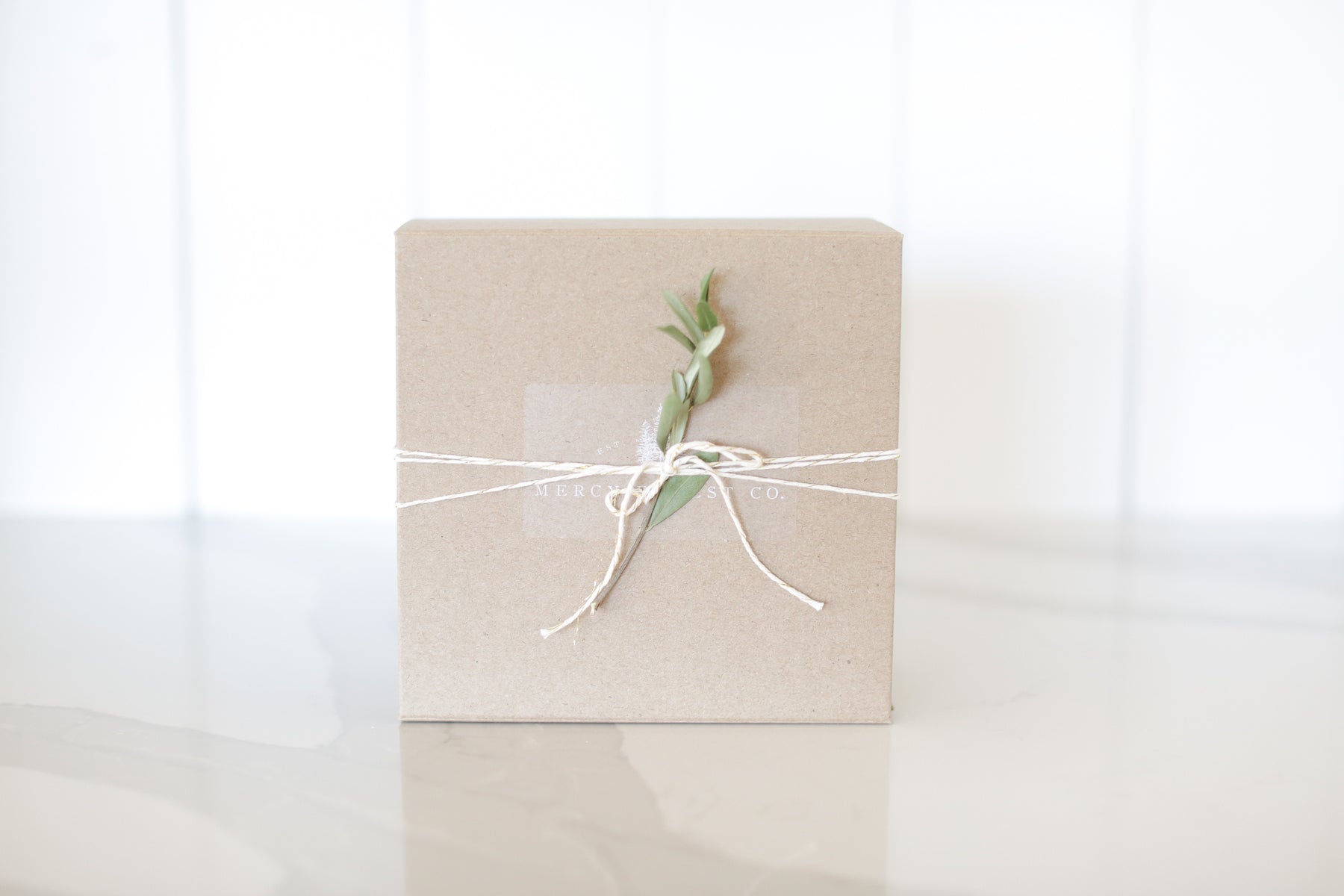 Gifts will be sent in a sturdy kraft box with magnetic closure. Complete with stuffing and muslin ribbon.