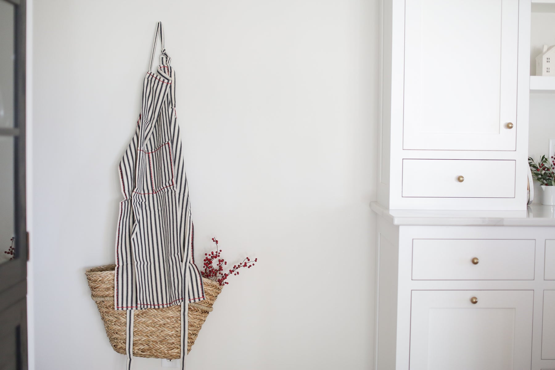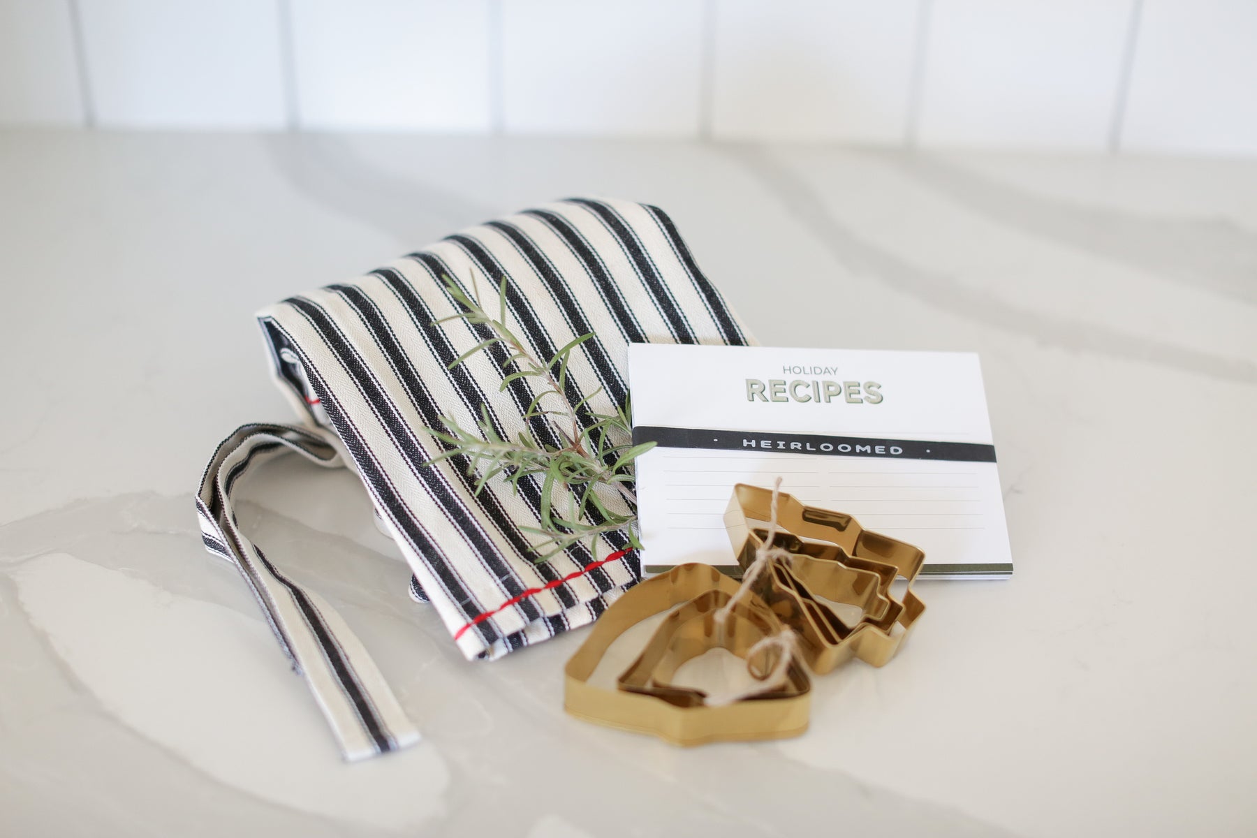 Happy Holidays! This gift box is a holiday bakers best friend. The Noel comes with a black and cream striped apron adorned with red stitching, recipe cards, and a set of bell shaped brass cookie cutters.