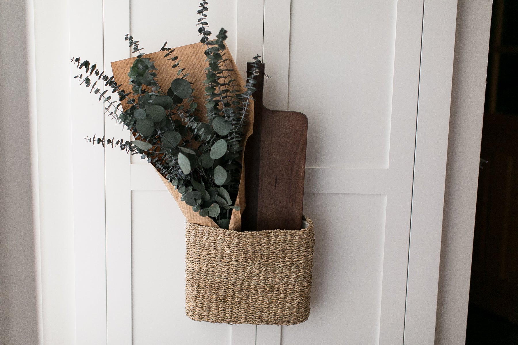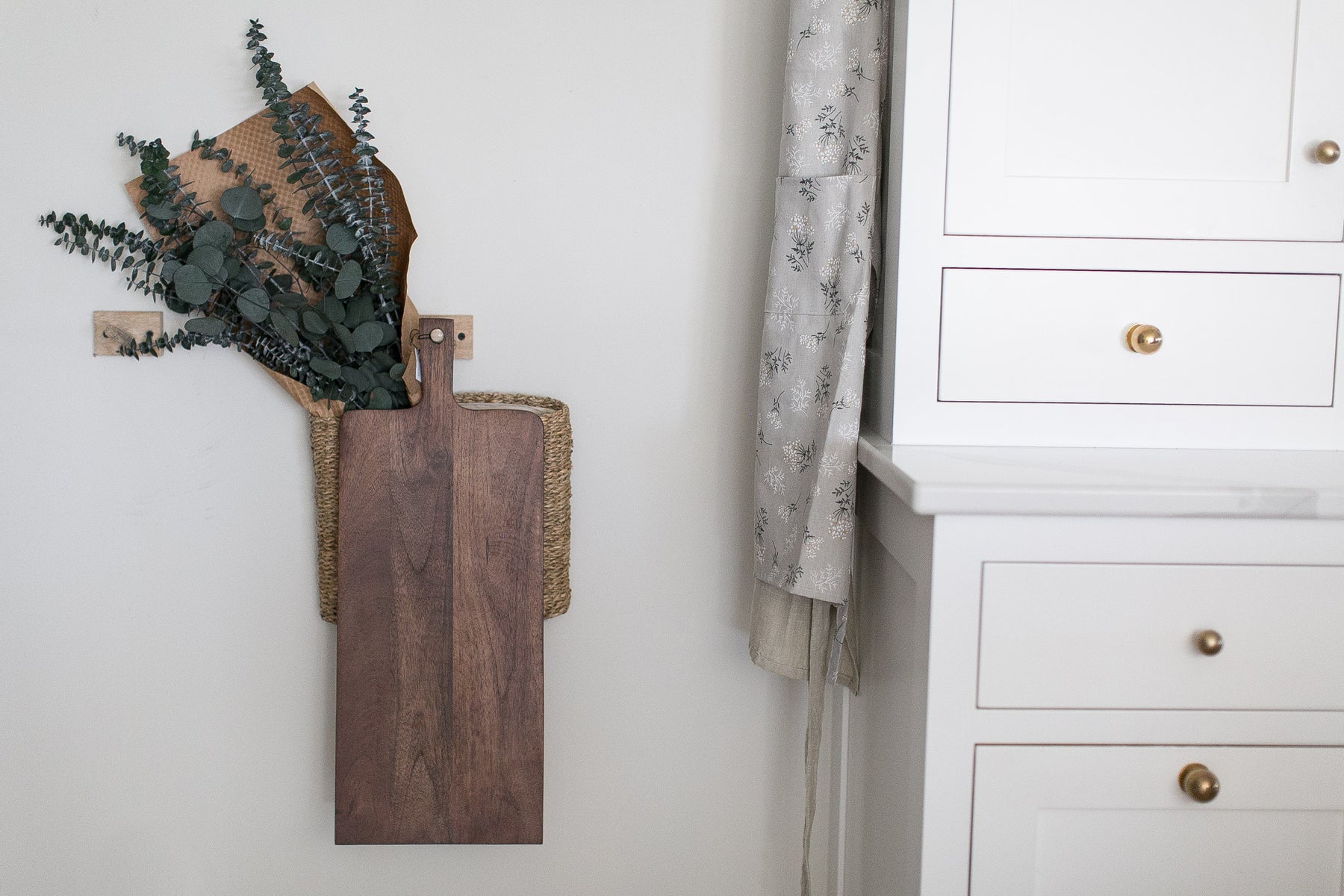 This collection brings natural beauty indoors, with textures and tones that feel grounded and refined. A bouquet of preserved eucalyptus adds organic softness and a gentle, lingering fragrance. The large walnut-stained board — perfect for serving, styling, or display — can be personalized with engraving for an extra meaningful touch. Completing the set, a handwoven wall basket with a soft cotton lining offers both charm and function, whether used for storing essentials or displaying fresh linens.