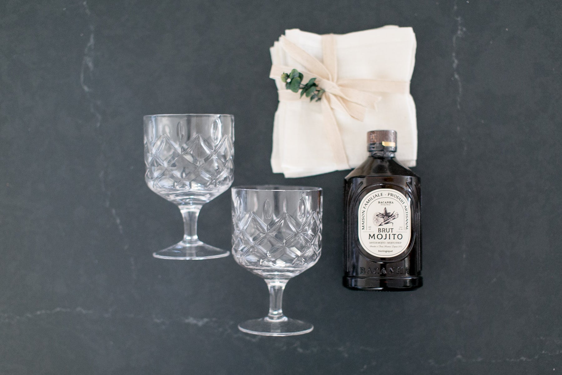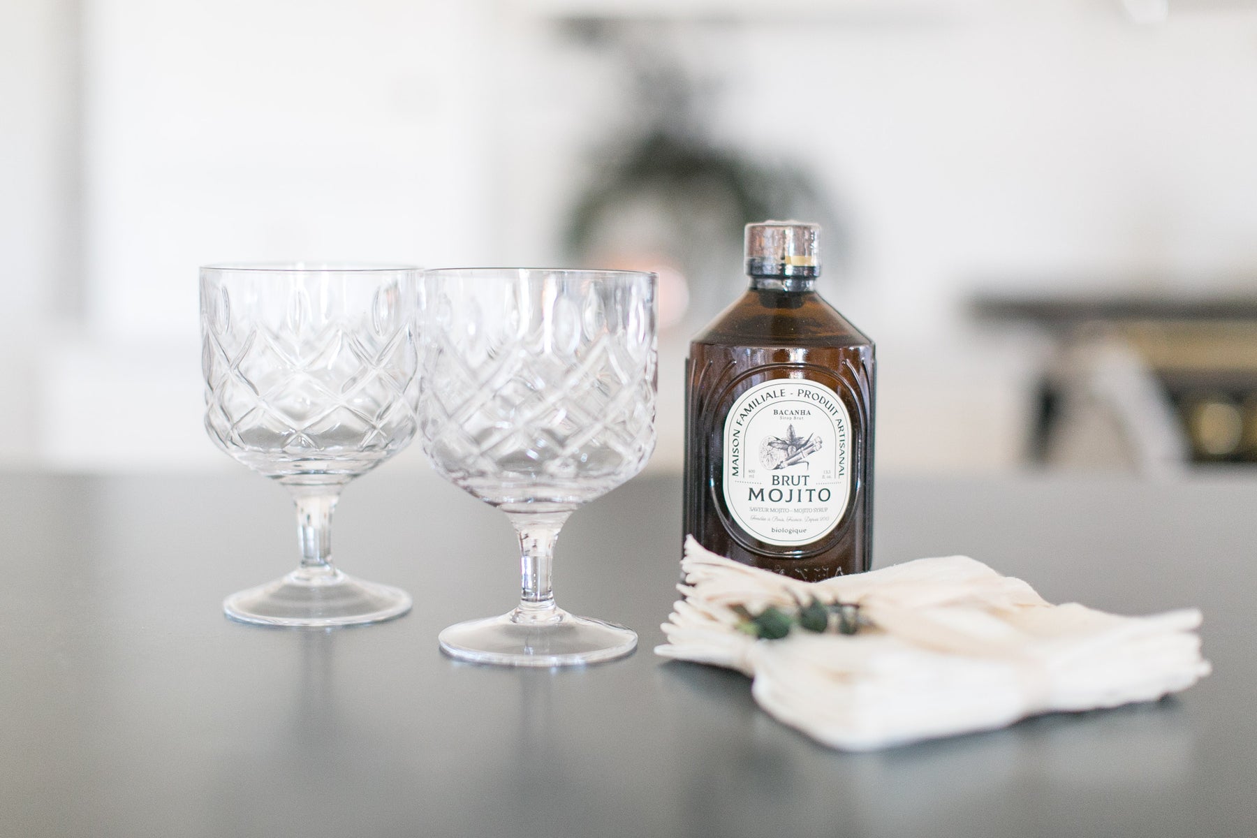 Mary features Bacanha Brut Mojito Mix, crafted in Paris, France — a sophisticated syrup that’s perfect for cocktails, iced teas, lemonades, or simply with still or sparkling water. Paired with two stemmed faceted glasses and a set of cotton cocktail napkins, this collection turns every pour into an elevated experience.